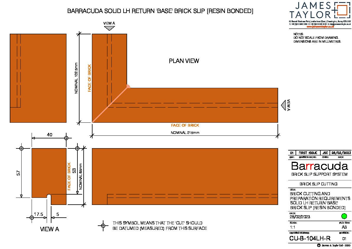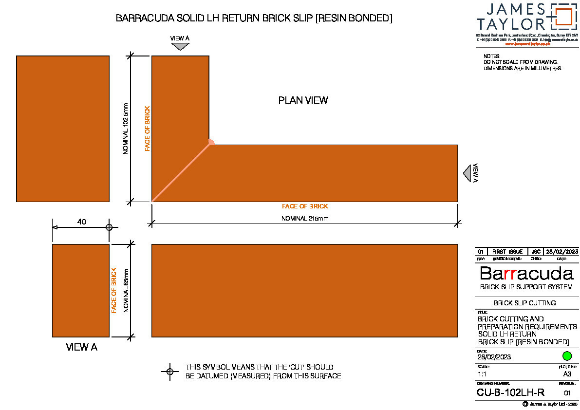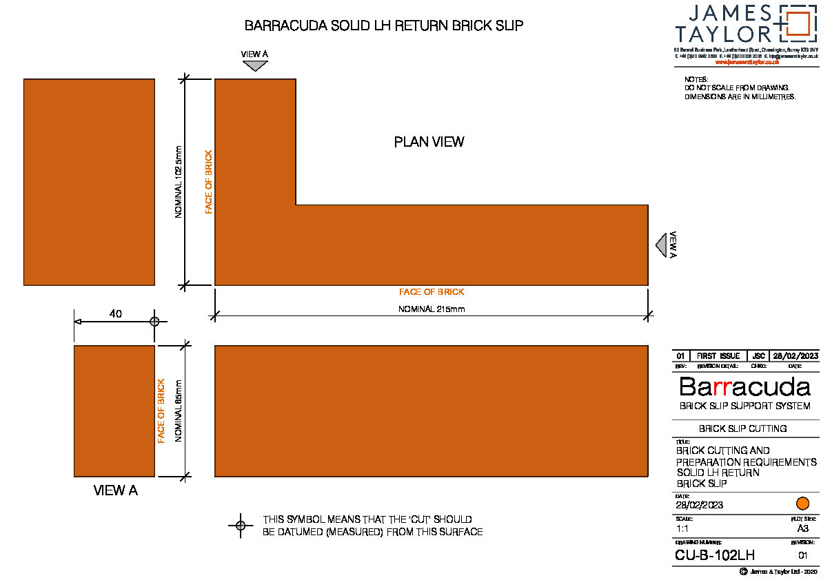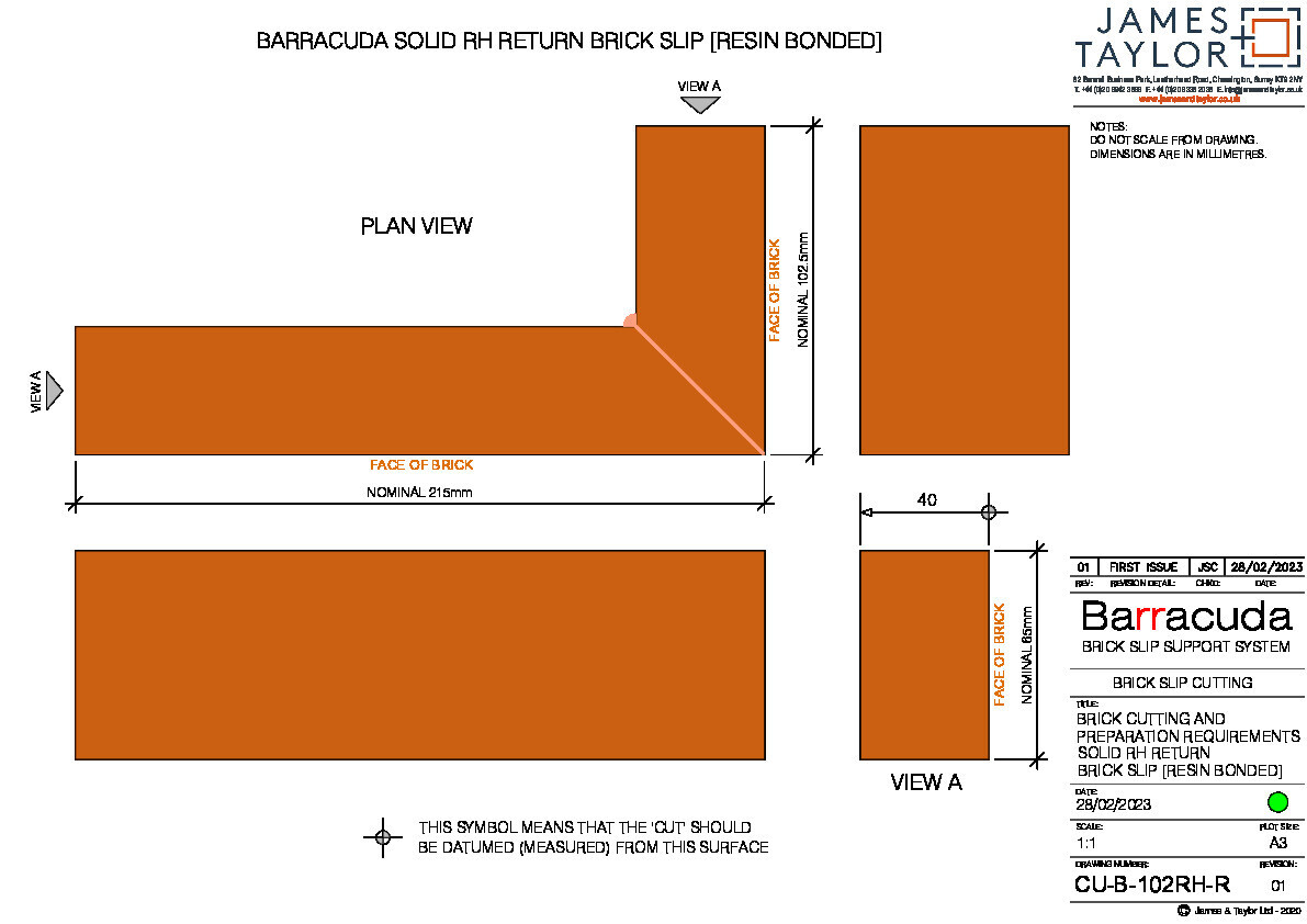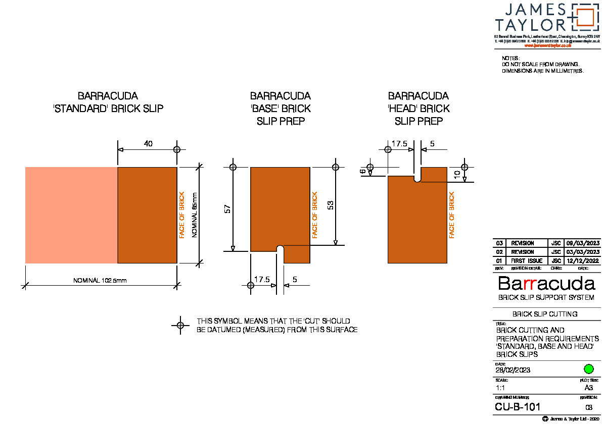 Brick slips must be cut in accordance with James & Taylor Barracuda brick slip cutting drawings; CU-B-101 to CU-B-104RH-R.